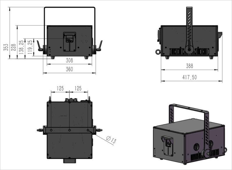 WP-RGB40W has very good white balance & small divergence. With Pro version digital driver which can dimmer from 2% to 100% and has faster cooling & less heat & less power consumption, so the laser system can work in different environment no matter hot or cold, and laser diode also has a longer lifetime.